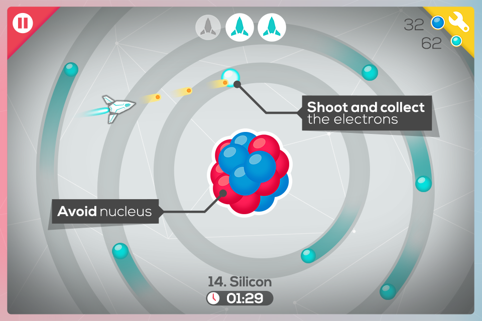 Para cada uno de los 118 niveles / elementos de la tabla periódica se obtiene 3 barcos para tratar de terminarlo, y desbloquear la siguiente. Su rendimiento en 3 categorías: tiempo, electrones y neutrones recogidos recogidos se mide con estrellas de bronce, plata y oro. Siempre se puede volver a cualquier nivel de acabado para dominarlo.