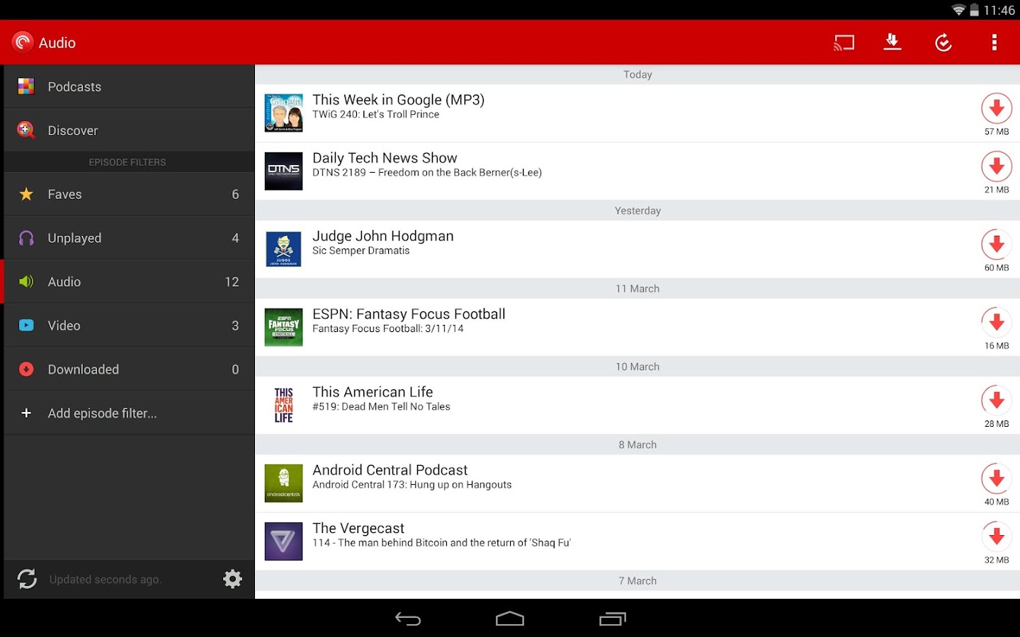 Manténgase al día con todos los últimos podcasts (o netcasts si eres Leo ) con una aplicación fácil de usar . Sólo tienes que añadir tus podcasts favoritos , y usted será capaz de transmitir o descargar nuevos episodios a medida que estén disponibles.
